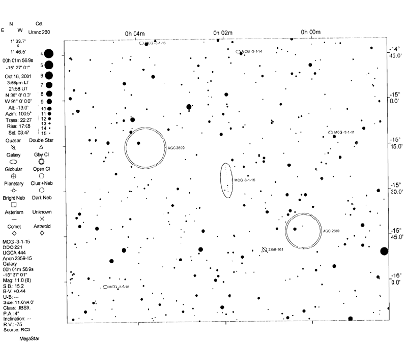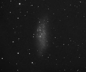 WLM lies near the border of Cetus and Aquarius and is best found by starting at R aquarius and then moving 4.5 degrees due east. The galaxy is visible in scopes 10" and larger with medium to high magnifaction. Through the 20" the galaxy appears as an 8' by 3' haze and has an even surface brightness. No nucleus is visible. The edge of the galaxy was illdefined against the sky background. In scopes of 16" and larger the observer may be able to catch a glimps of WLM's globular cluster. It appears as a 16th magnitude star almost 3' west of the centre of the galaxy and about 1' south of a 14.5 magnitude star.