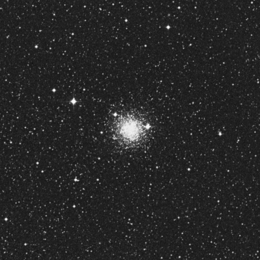 Observed with an 18" f4.5 NGT. Appeared as a oval haze with the long axis east/west. The cluster was unresolved, set between two 12th magnitude stars in a line of 3. Slightly condensed to the centre with irregular soft edges.
