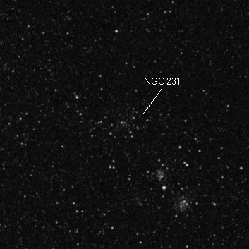 The original description of the object was an "irregular train of stars and nebula". Upon looking at this cluster though I could only call this partly correct. The cluster is a scattering of mostly 13th and 14th magnitude stars in an irregular shape not well defined from the sky background. The cluster is 1½ arc minutes across and is located 2 arc minutes north east of NGC 222. The cluster should be visible in a 10" telescope and appears well resolved in larger scopes, as the fainter stars become visible. Upon checking the cluster with the UCH and O111 filter I was unable to find any associated nebula. In fact all 3 nebula we free of nebulosity. This group of 3 clusters can be seen in 10" scopes together when viewed at medium to high power. These clusters lie on the western edge of a fairly bright star cloud.