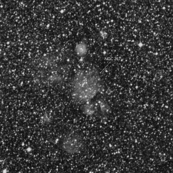 The cluster is almost 2 arc minutes in diameter. There is no central condensation, and because it lies in the star cloud, the cluster is harder to pick from the background. The brightest stars should be visible in a 10" telescope and appears to be fully resolved in the 20". Herschell's description advised that it included some associated nebula. When a UHC filter is employed the whole field of eyepiece came to life. The cluster NGC 267 is enshrouded in nebula, which appears to extend the object to 6 arc minutes. Directly to the east is a second separate nebulous area classified as N28. This nebula was fainter in surface brightness than the nebula surrounding the cluster.