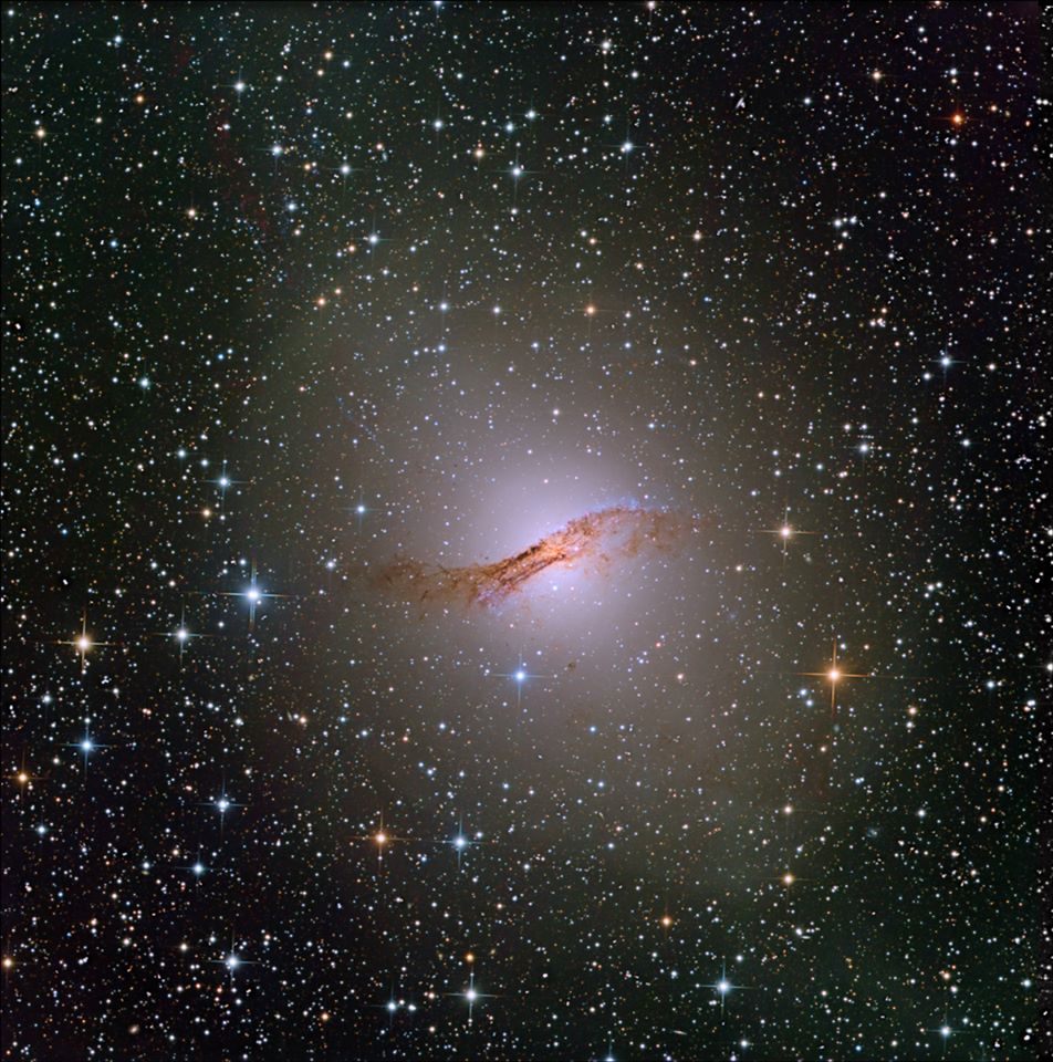 It is believed that Centaurus A was originally a large elliptical galaxy which collided and merged with a smaller spiral galaxy which resulted in the obvious, superimposed dust lane for which it is so well known.