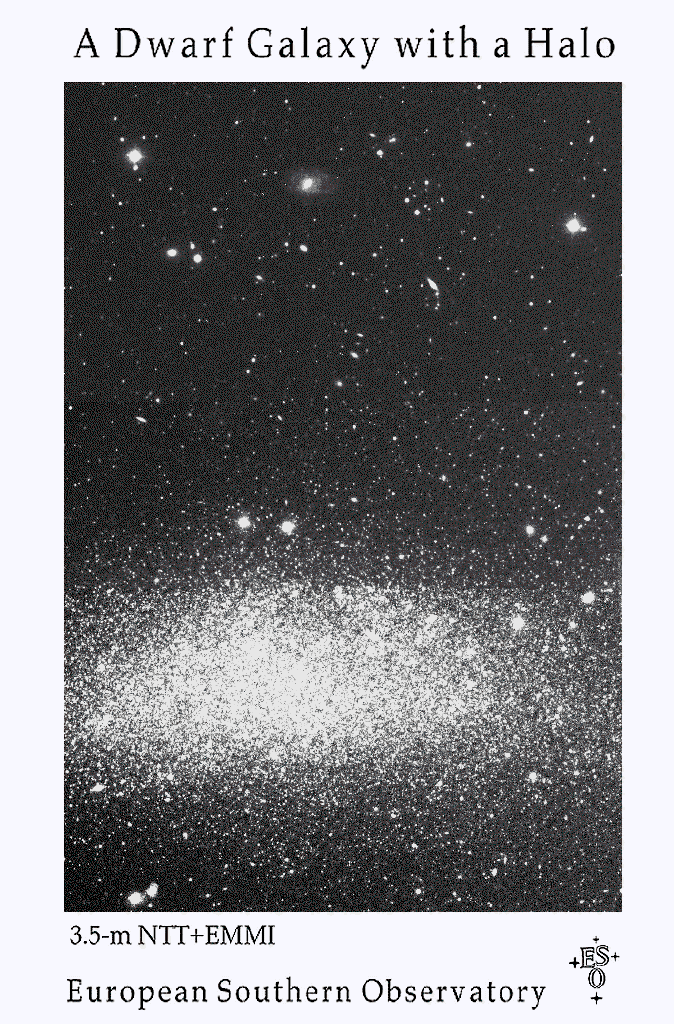 ESO photo showing the halo surrounding the galaxy WLM. The dimensions on this photo is 8 x 11.5. This corresponds to a real diameter of 10,000 x 6,000 light years.