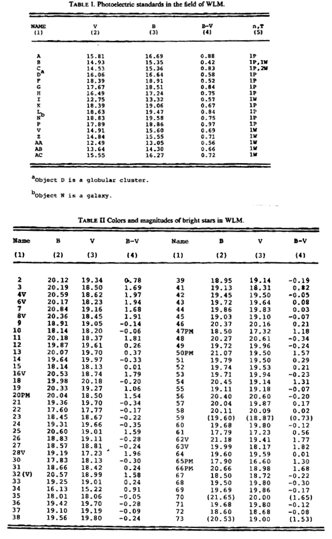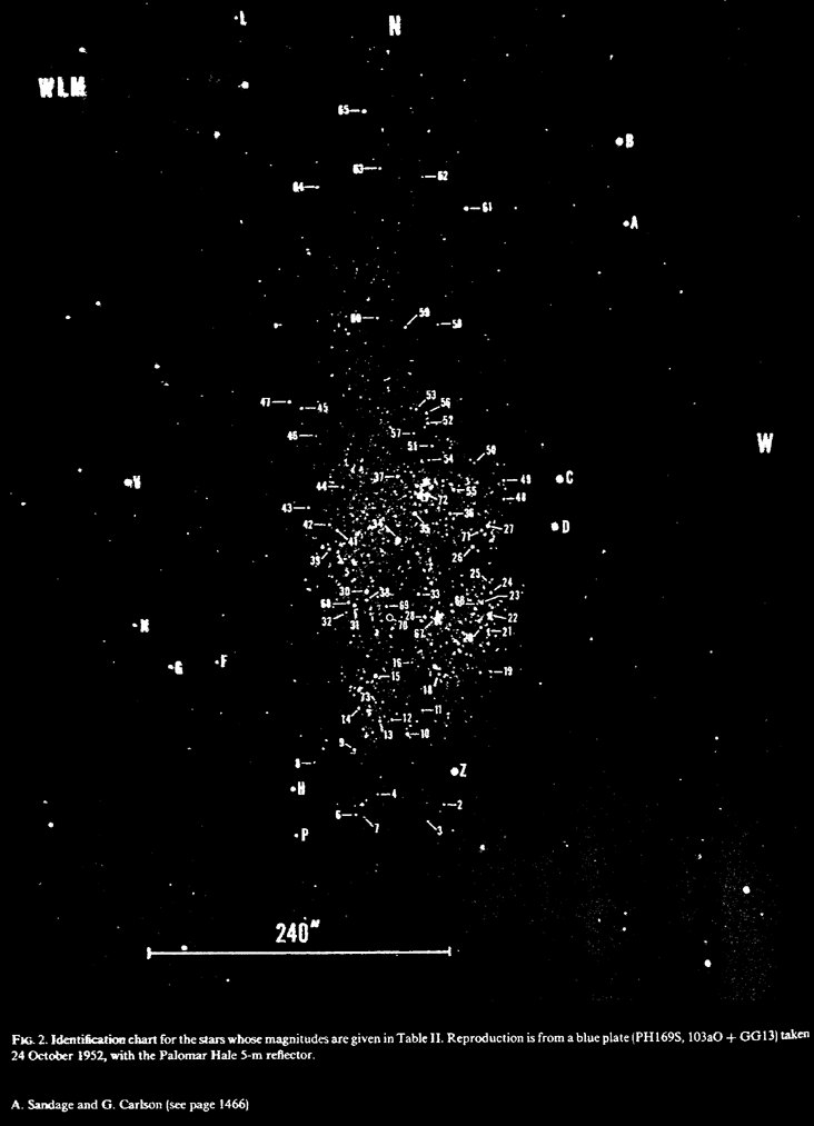 WLM had been observed many times between 1926 and 1956 to locate Cepheid variables to determin the galaxies distance. All attempts failed to reveal any pulsating variable stars. Eventualy in 1956 Humason measured the heliocentric velocity to be -78 ±20 km/s-1. This velocity showed that WLM was a member of the Local Group and a nearby galaxy. Only Cehpeid variables with periods of 10 days or less are observed in WLM. This appears due to either a lack of stars between 7-11 solar masses or the metal abundences in the galaxy prevented these mass stars from entering the Cepheid variable phase.